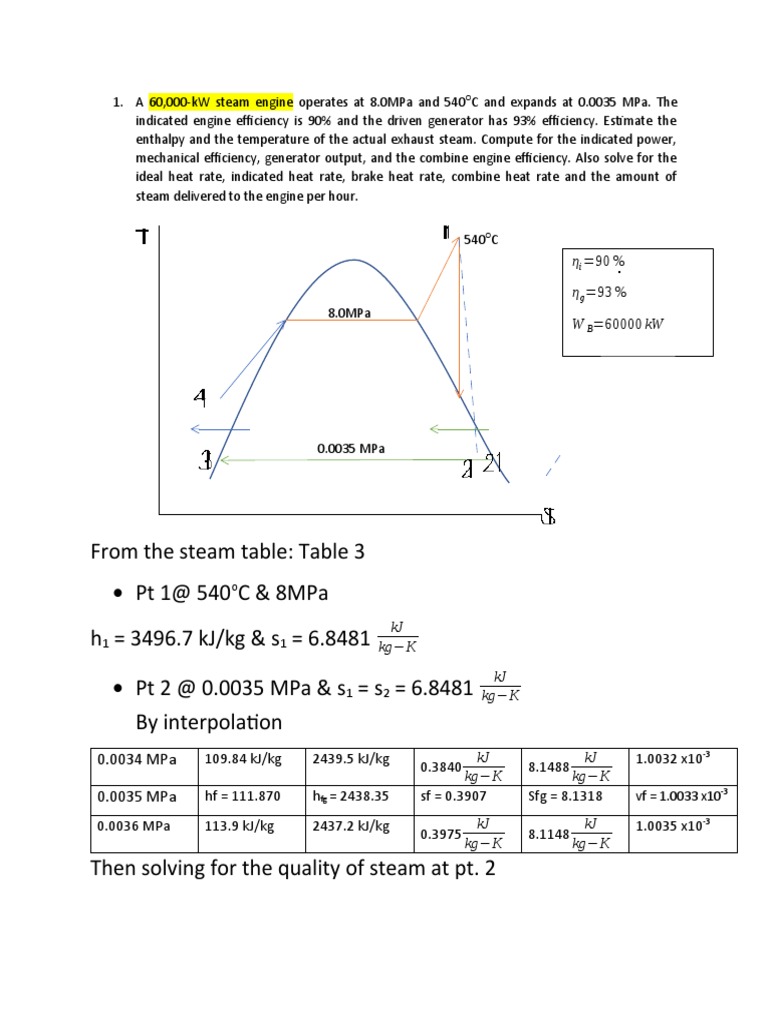 1. A 60,000-kW steam engine operates at 8.0MPa and 540OC and expands at 0.0035 MPa.