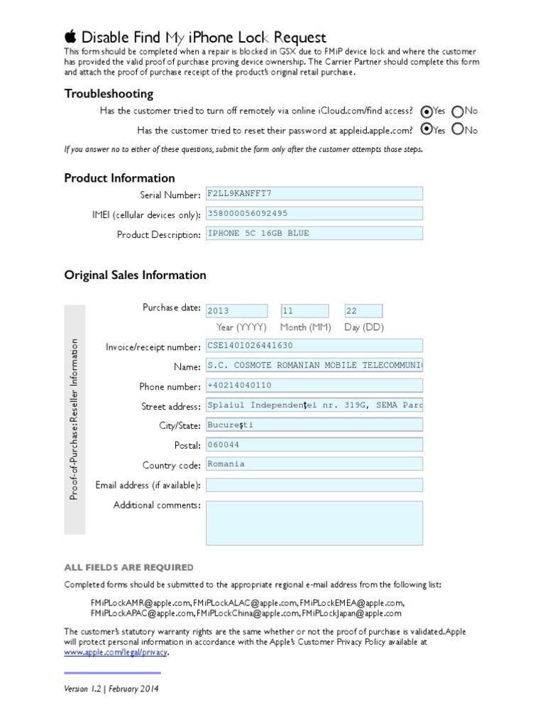 This form should be completed when a repair is blocked in GSX due to FMiP device lock and where the customer