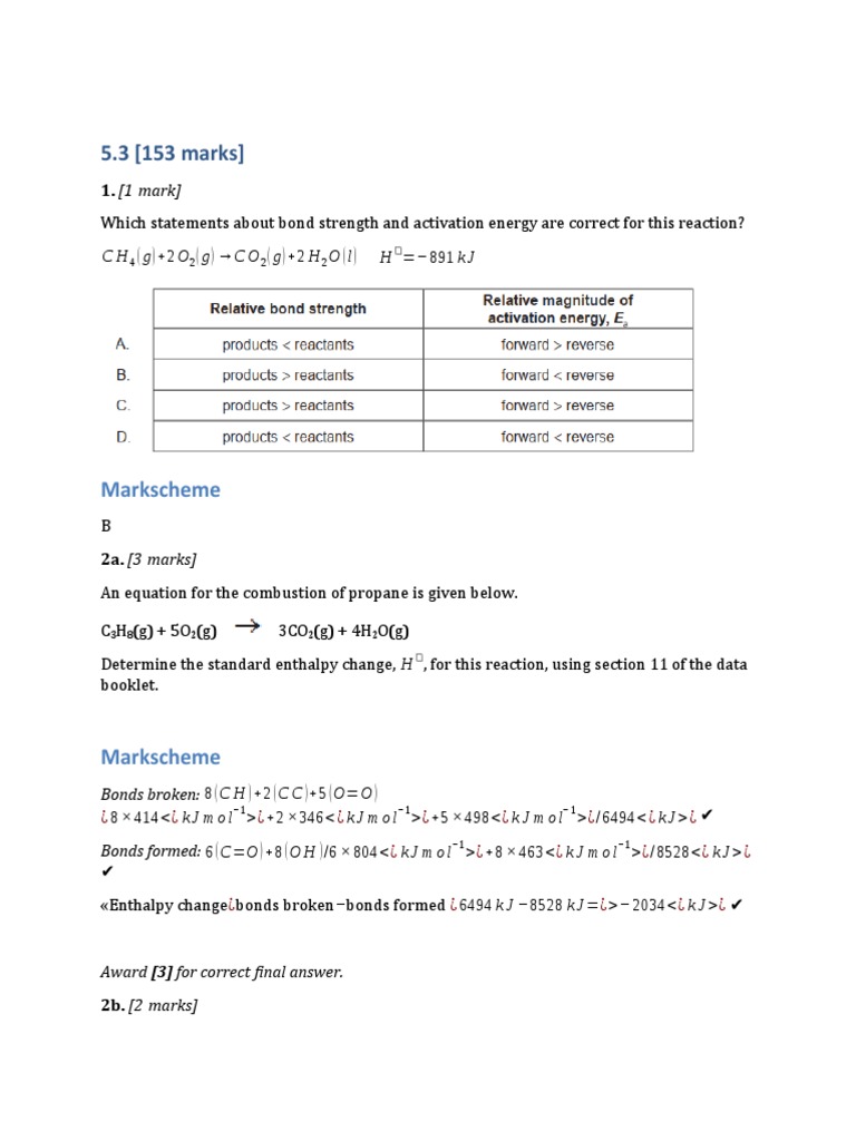Bonds broken: 8(C–H) + 2(C–C) + 5(O=O) / 8 × 414 «kJ mol−1» + 2 × 346 «kJ mol−1» + 5 × 498