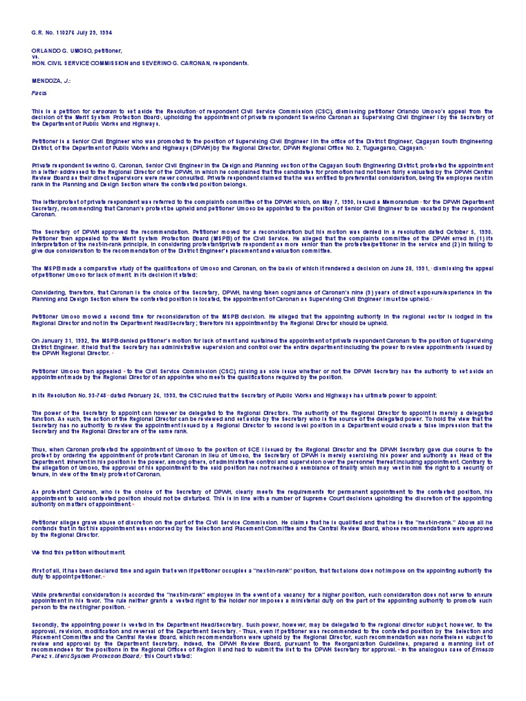 Petitioner Umoso then appealed to the Civil Service Commission (CSC), raising as sole issue whether or not the DPWH Secretary has the authority to set aside an