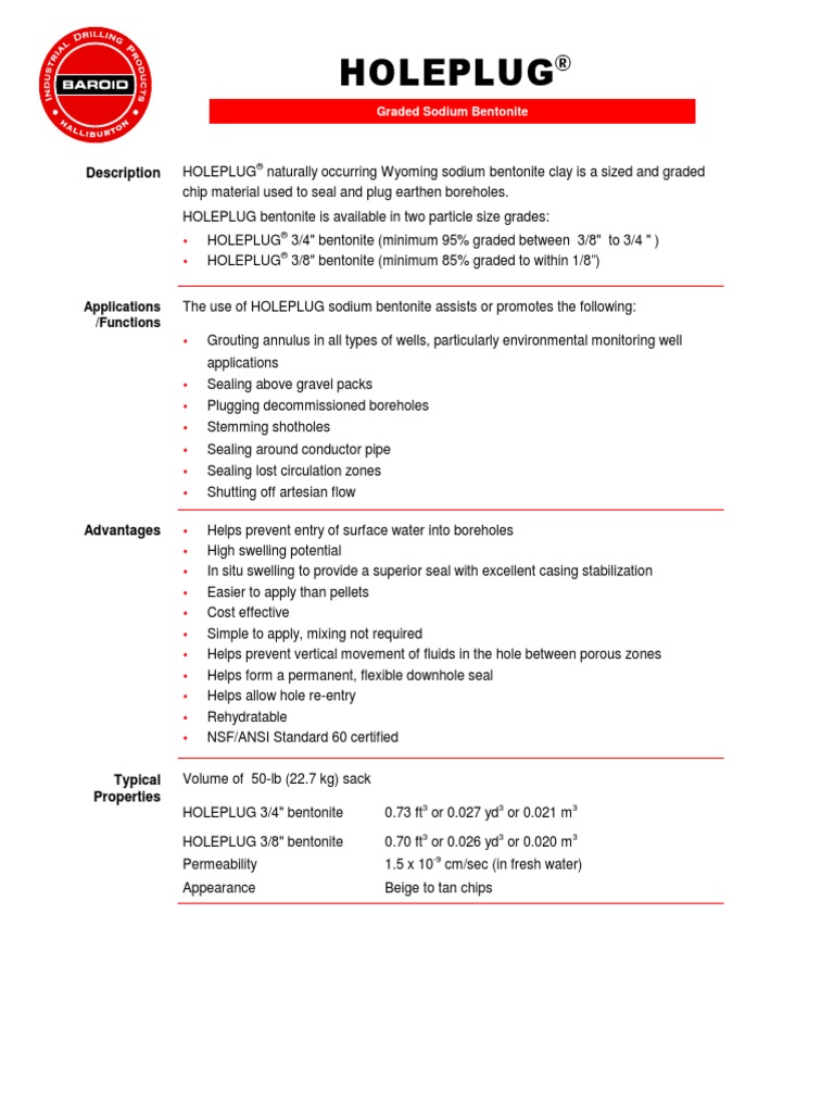 Availability HOLEPLUG graded sodium bentonite can be purchased through any Baroid Industrial Drilling