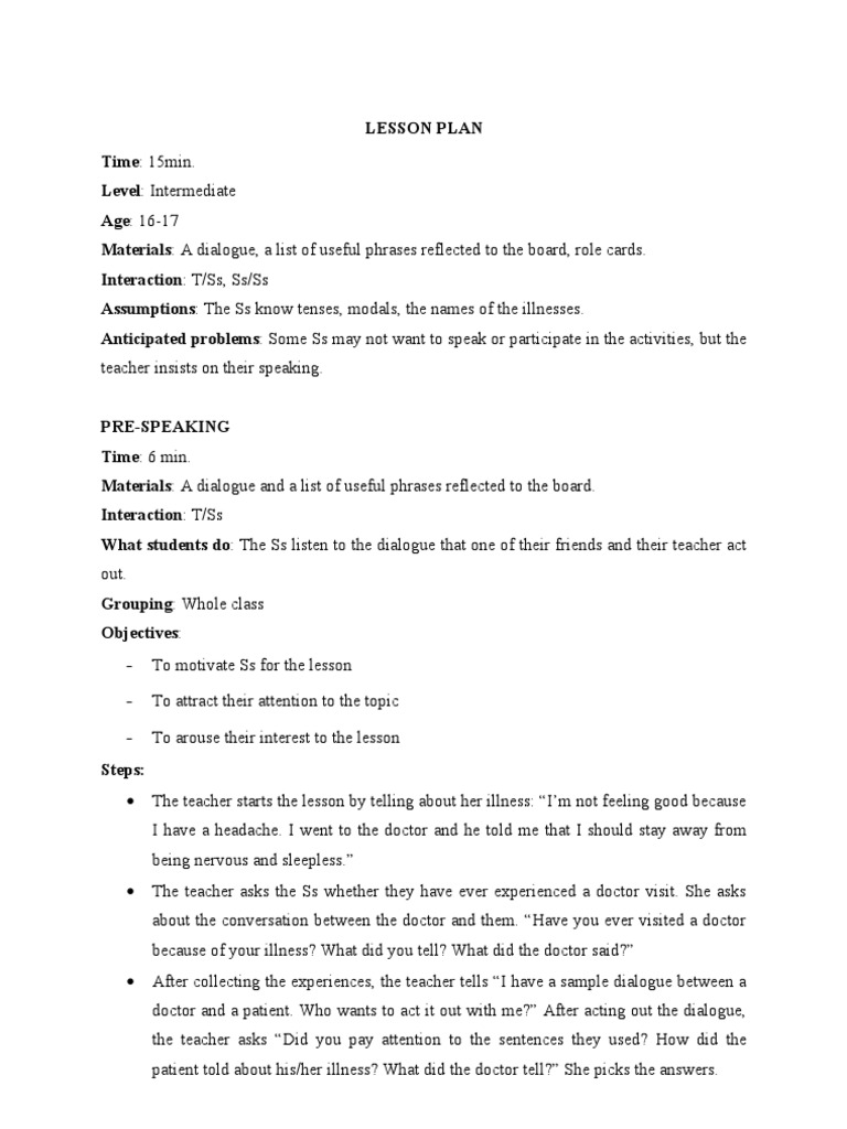 • The T gives the Ss 30 seconds to think about the illness and prepare a speech that