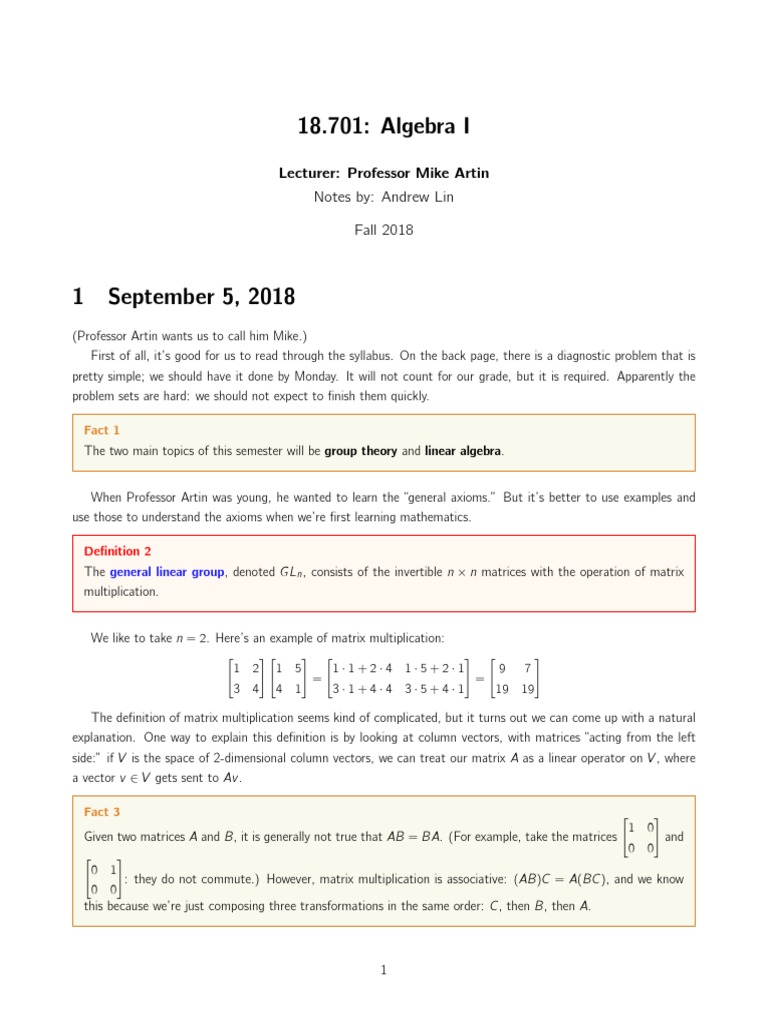 18.701: Algebra I: Lecturer: Professor Mike Artin Notes By: Andrew Lin Fall 2018