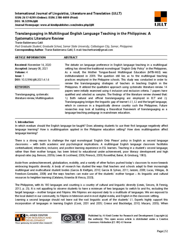 Translanguaging in Multilingual English Language Teaching in the Philippines: A Systematic Literature Review