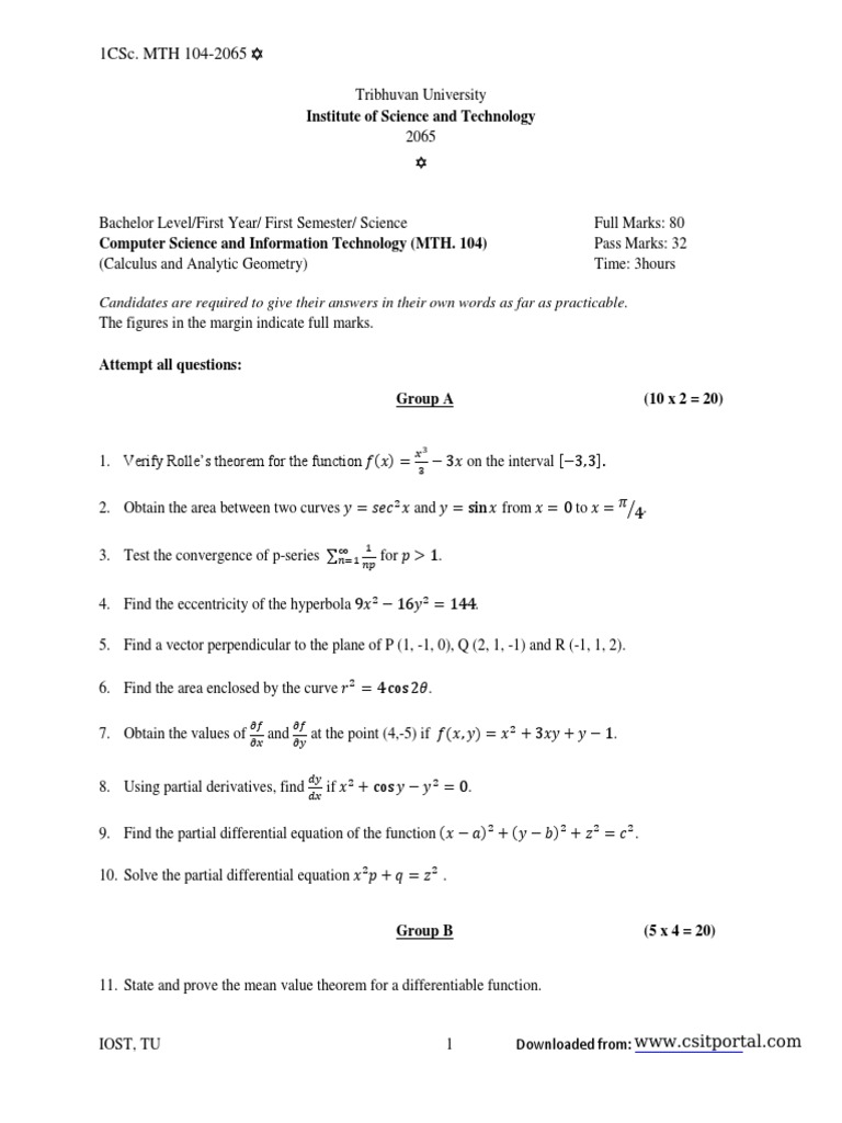 Computer Science and Information Technology (MTH. 104) Pass Marks: 32