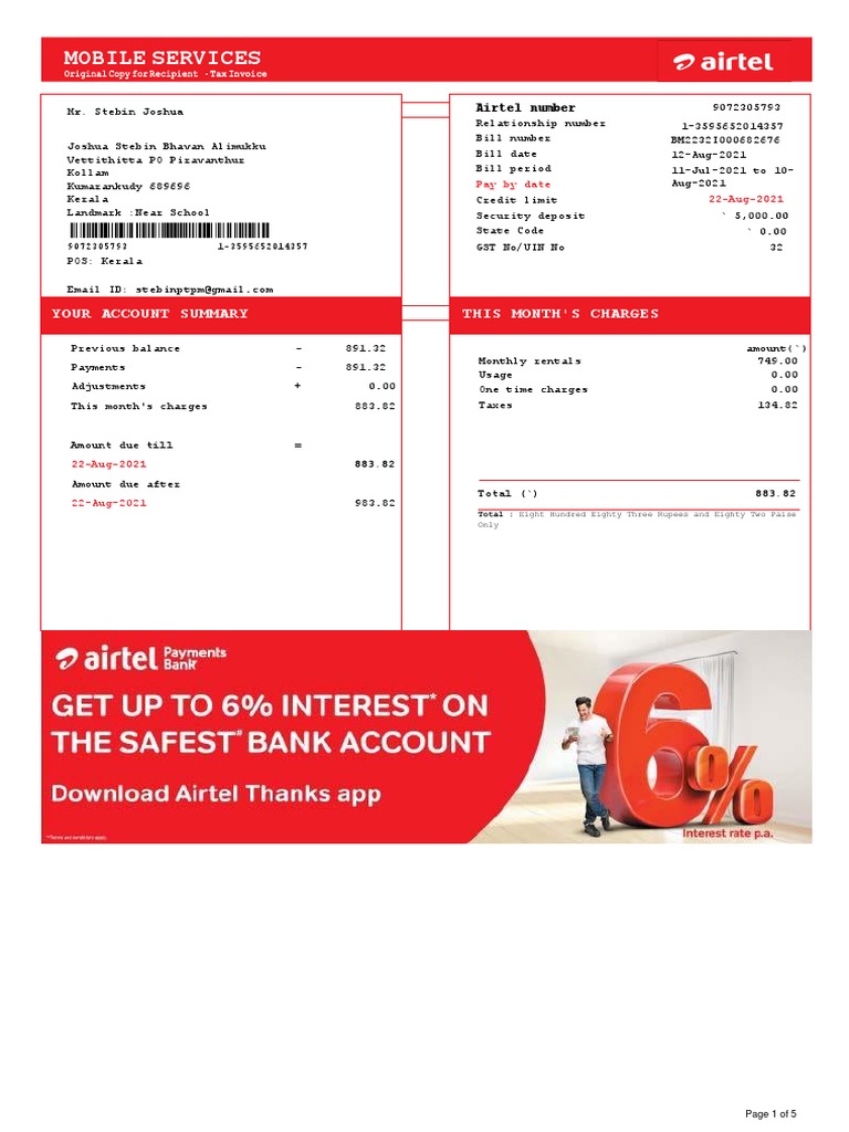 Account no. Airtel number Monthly rentals Usage One time charges Total