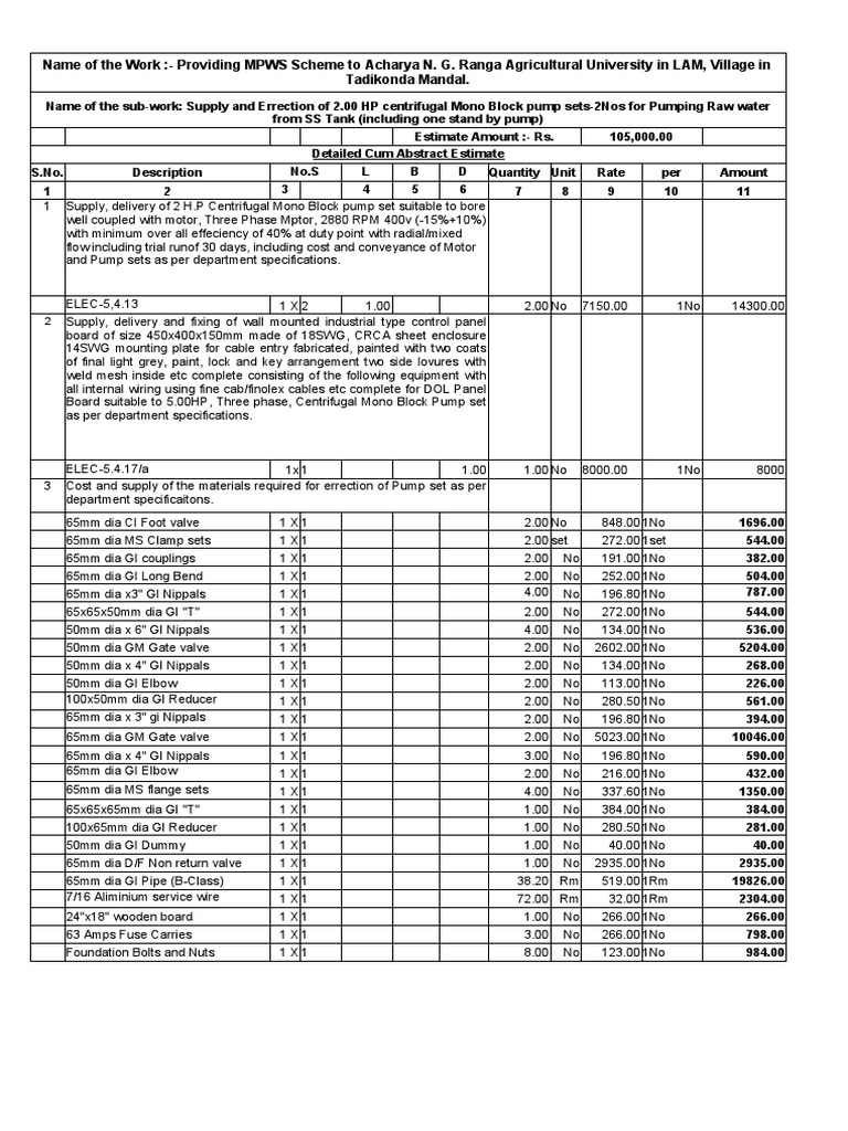 Name of the sub-work: Supply and Errection of 2.00 HP centrifugal Mono Block pump sets-2Nos for Pumping Raw water