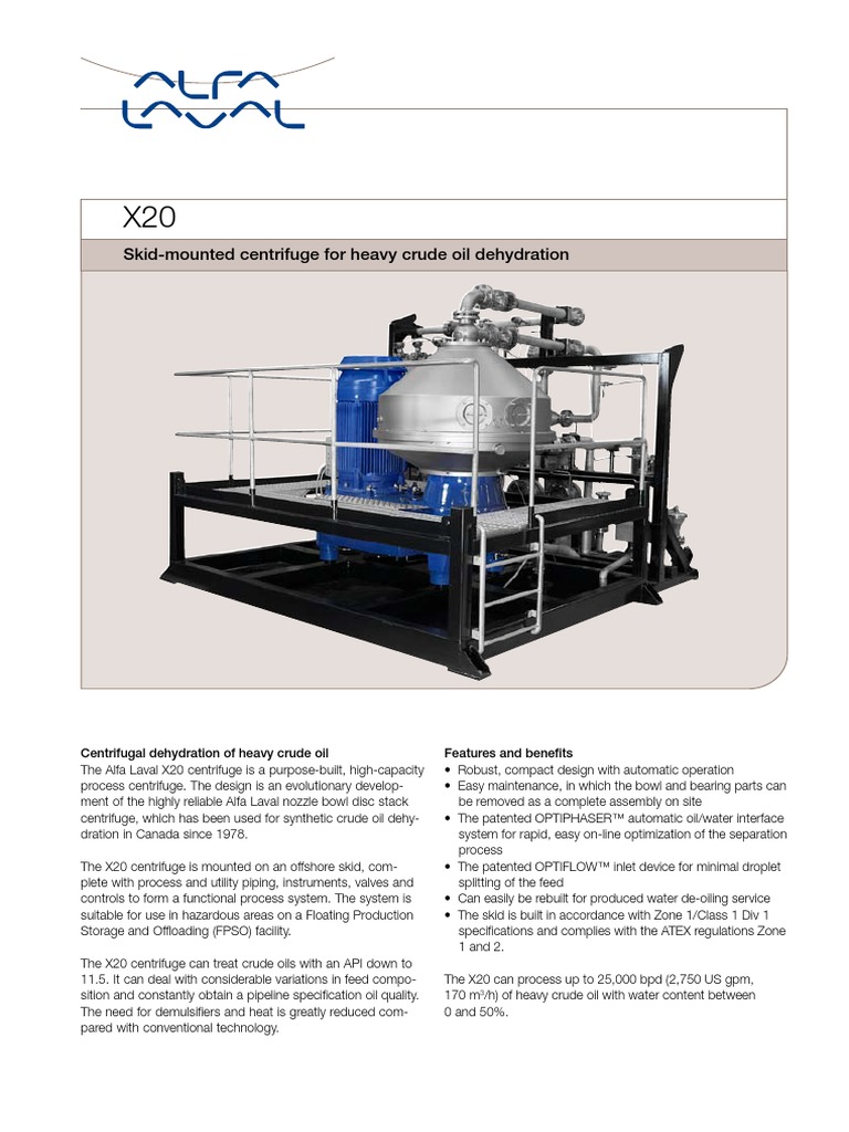 The X20 centrifuge is mounted on an offshore skid, com- • The patented OPTIFLOW™ inlet device for minimal droplet