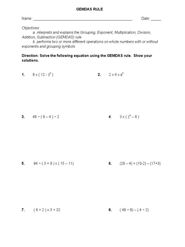 a. interprets and explains the Grouping, Exponent, Multiplication, Division,