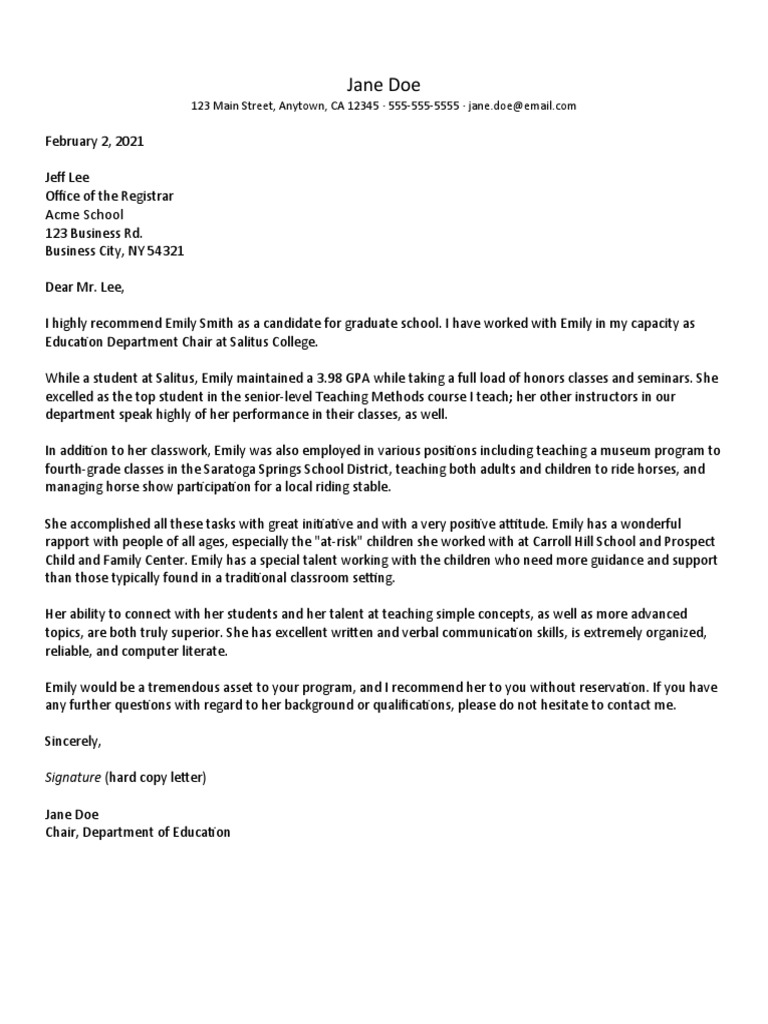 Emily would be a tremendous asset to your program, and I recommend her to you without reservation. If you have