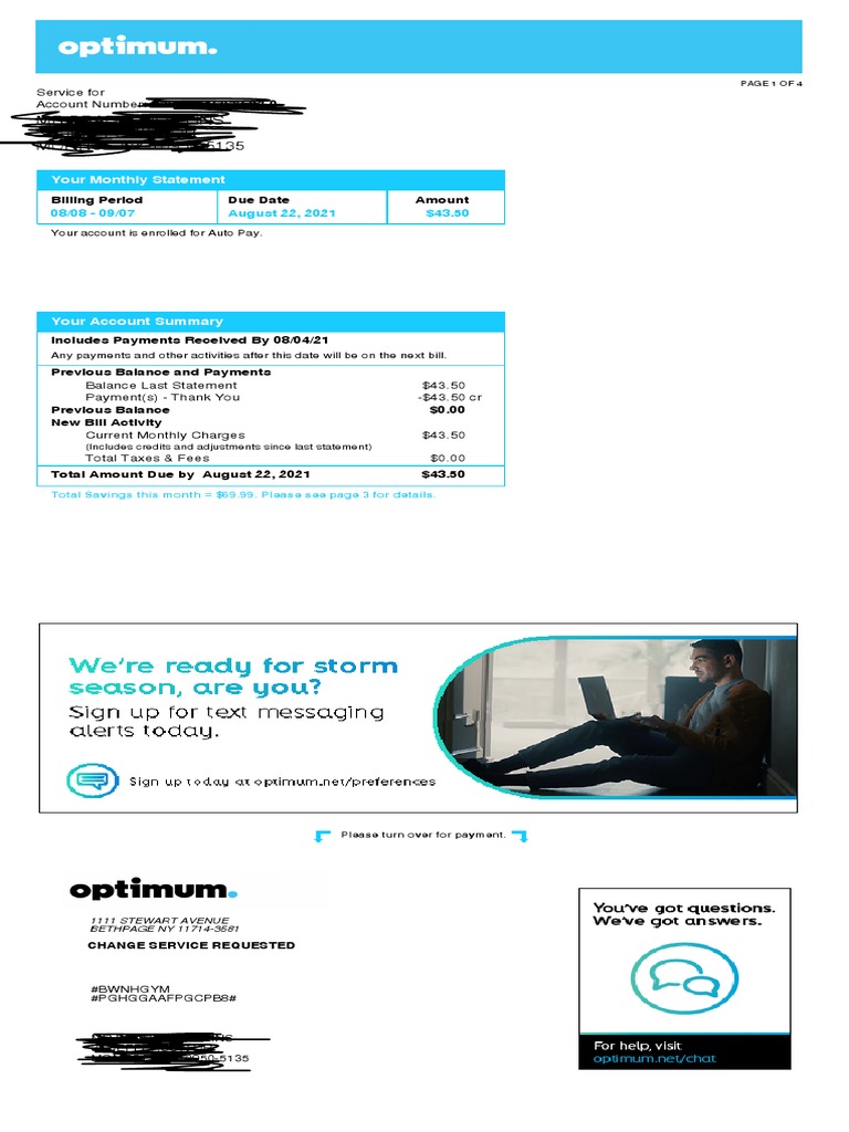 billing period. For more details, please visit www.optimum.net/terms. Rates subject to change or discontinuance at any time. At the end of