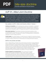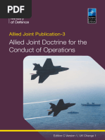 This document is the foreword to NATO's Allied Joint Publication 3, which provides doctrine on allied joint operations. It notes that modern military operations require forces to operate as a team, with capabilities selected from air, land, maritime and special operations forces. The aim of this publication is to establish NATO's joint operations doctrine to enhance common understanding of planning and conducting joint operations. It describes the fundamental operational aspects of joint operations and provides guidance to commanders and staff on conducting joint operations at the operational level across the range of military operations.