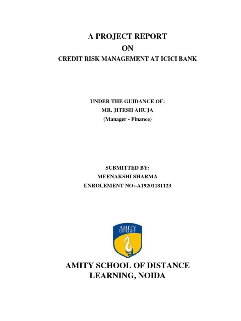This is to certify that the project work entitled “Credit Risk Management at ICICI