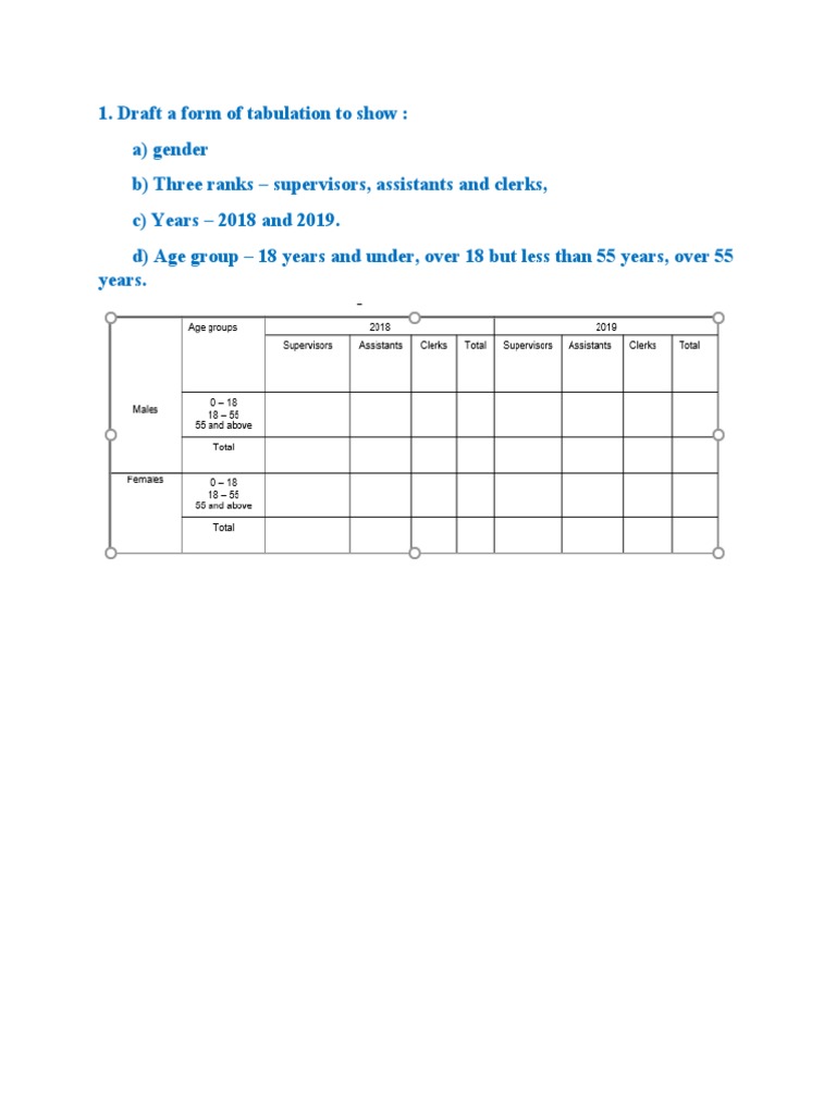 Draft a form of tabulation to show :