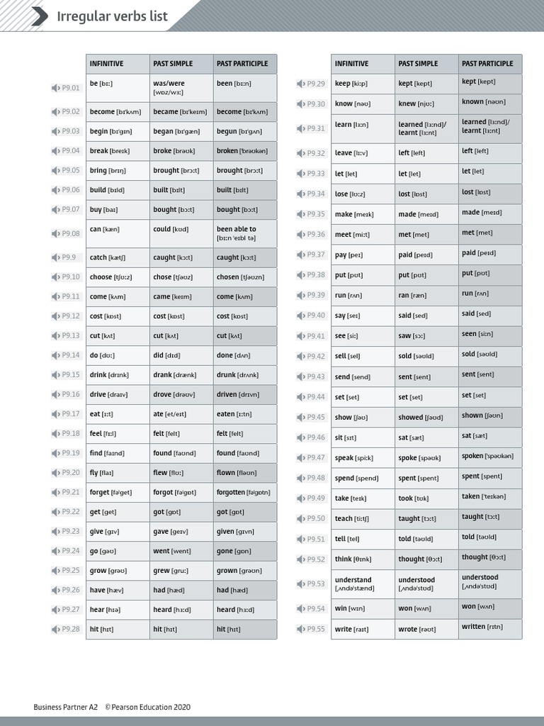 P9.03 begin [bɪˈgɪn] began [bɪˈgæn] begun [bɪˈgʌn] P9.31 learnt [lɜːnt]