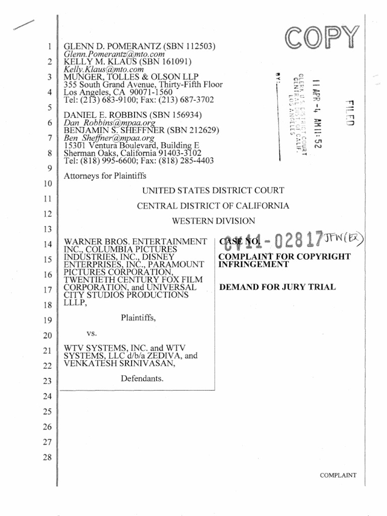 Warner Bros. Entertainment Inc. et al v. wrv Systems, Inc. et al Complaint; Exhibit A; page 1
