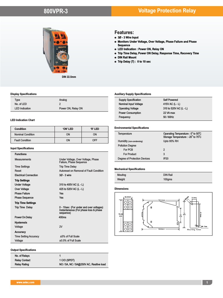 LED Indication Power ON, Relay ON Operating Voltage 310 to 520V AC (L - L)