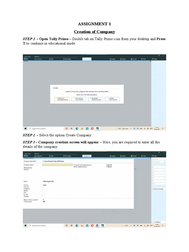1. Create a company in Tally with the following details: