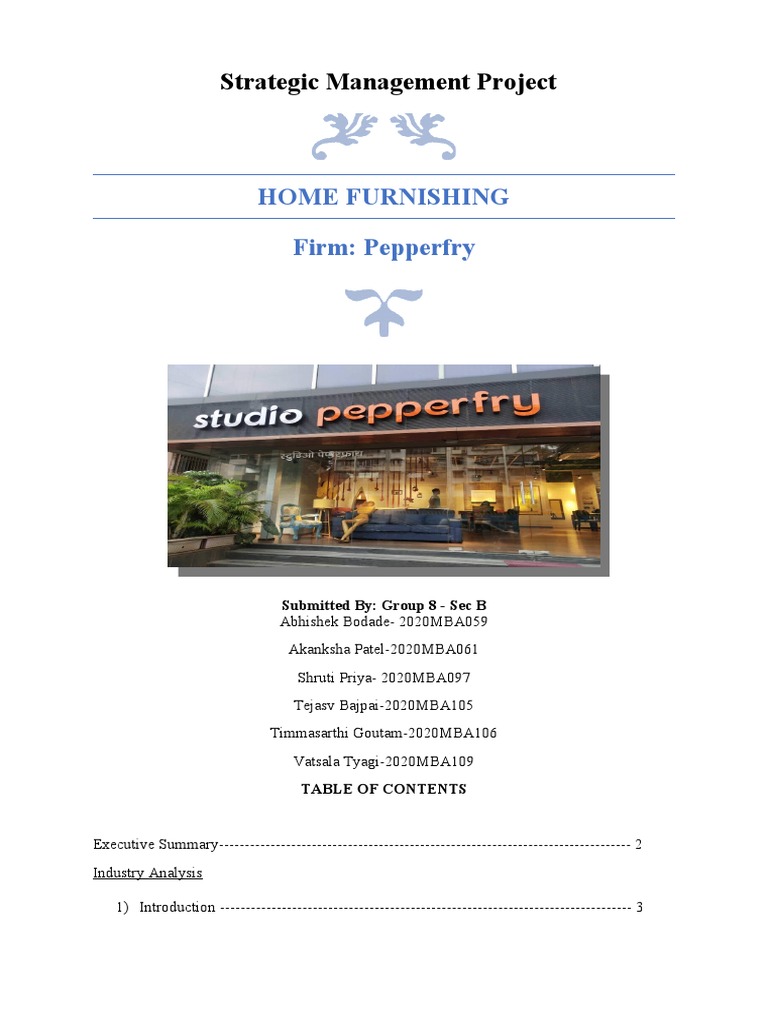 the organization Pepperfry. The report contains the industry frameworks and data that we