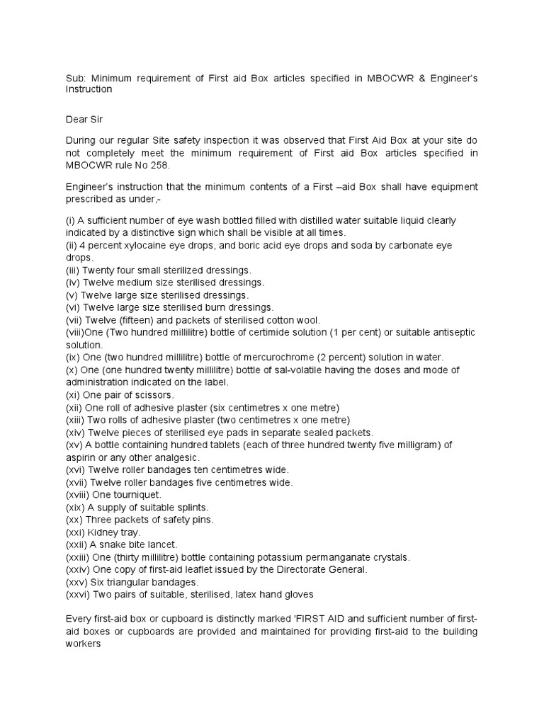 Sub: Minimum requirement of First aid Box articles specified in MBOCWR & Engineer’s