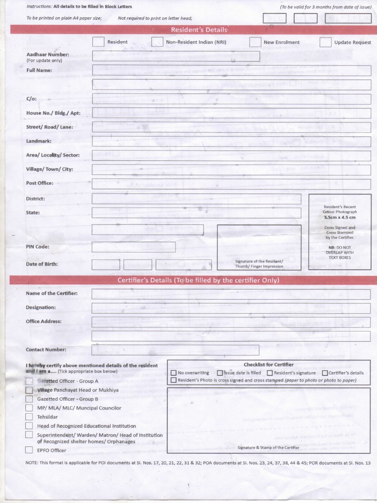 AADHAAR ENROLMENT/ CORRECTION/ UPDATE FORM