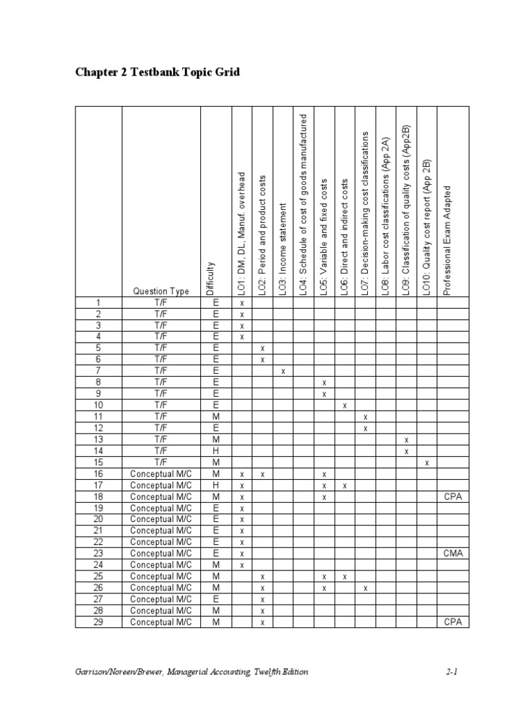 Chapter 2 Testbank Topic Grid: Garrison/Noreen/Brewer, Managerial Accounting, Twelfth Edition 2-1