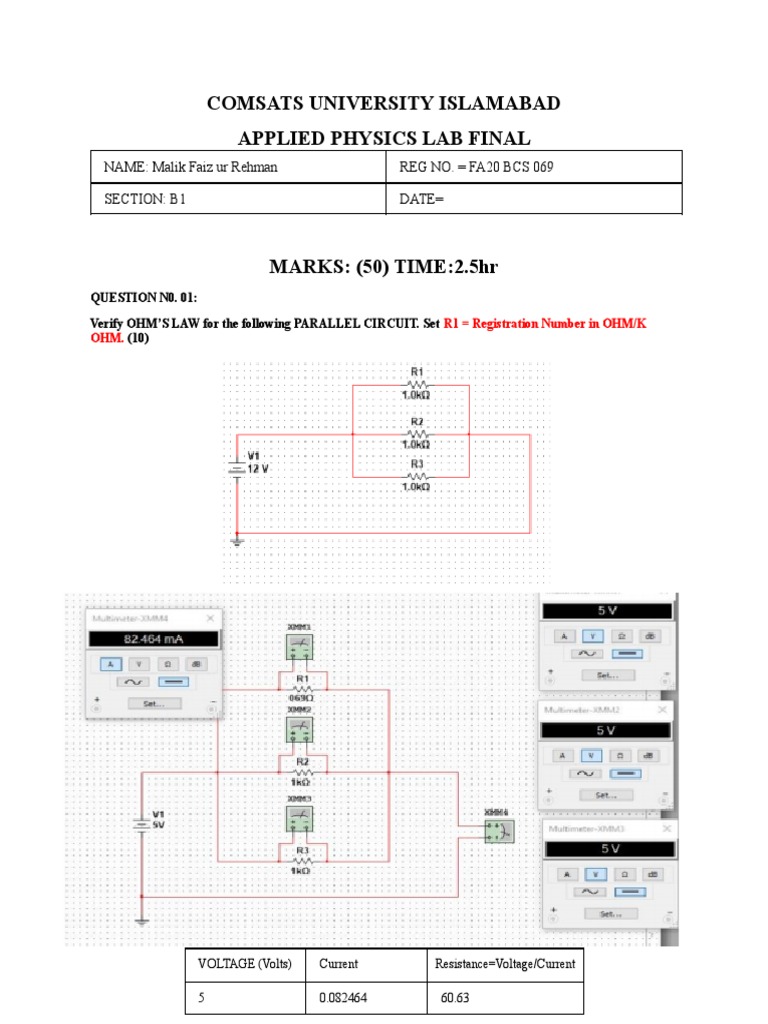 Verify OHM’S LAW for the following PARALLEL CIRCUIT. Set R1 = Registration Number in OHM/K