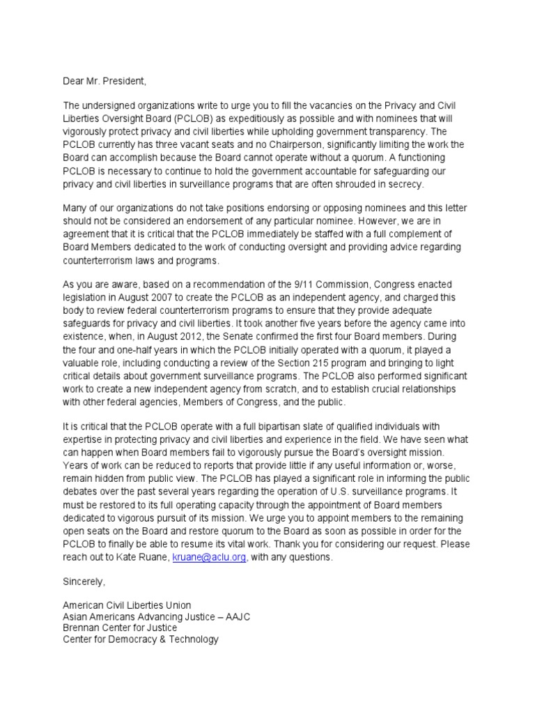 The undersigned organizations write to urge you to fill the vacancies on the Privacy and Civil