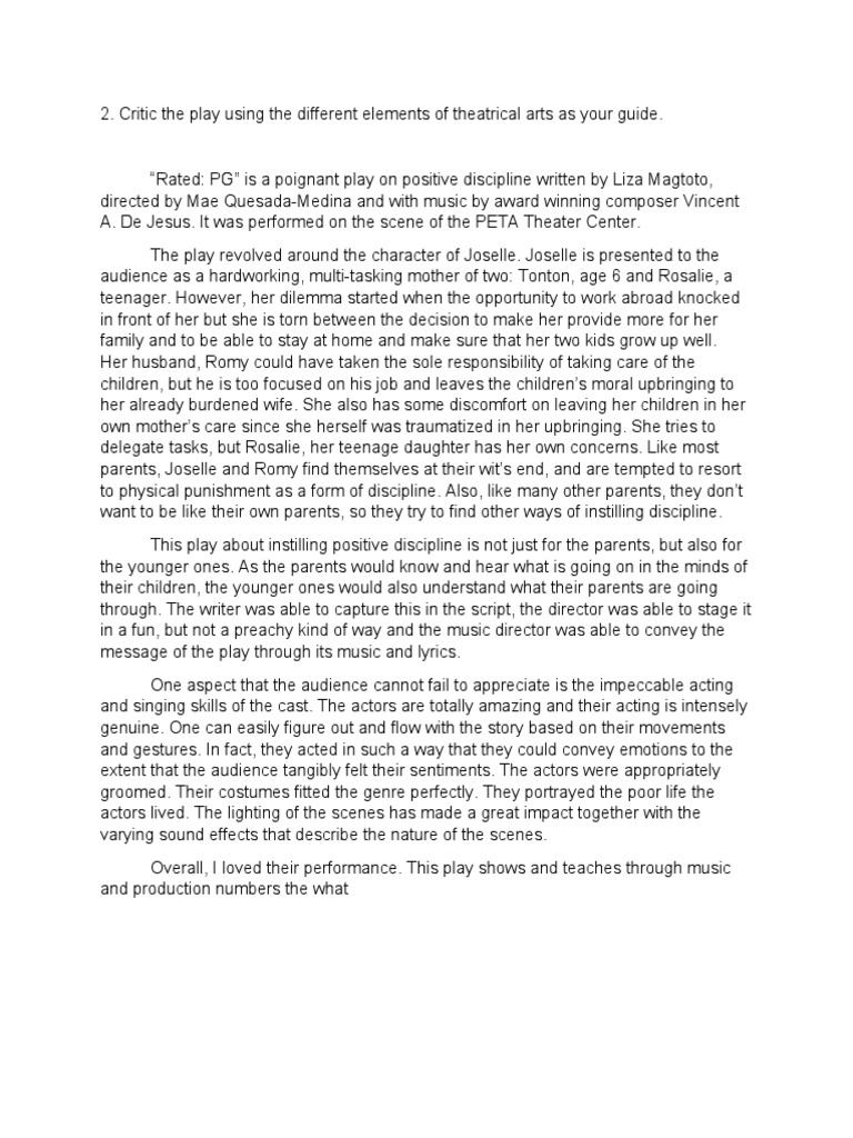 2. Critic the play using the different elements of theatrical arts as your guide.