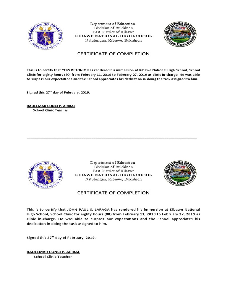 This is to certify that YEVS BETONIO has rendered his immersion at Kibawe National High School, School