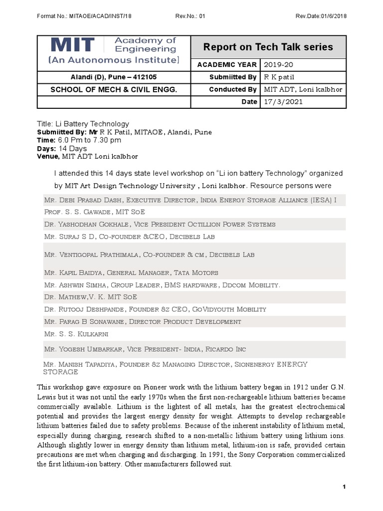 I attended this 14 days state level workshop on “Li ion battery Technology” organized