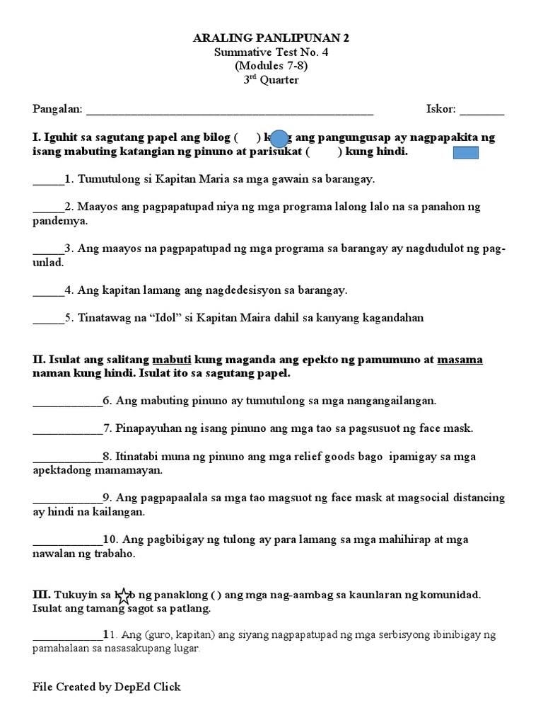 _____1. Tumutulong si Kapitan Maria sa mga gawain sa barangay.