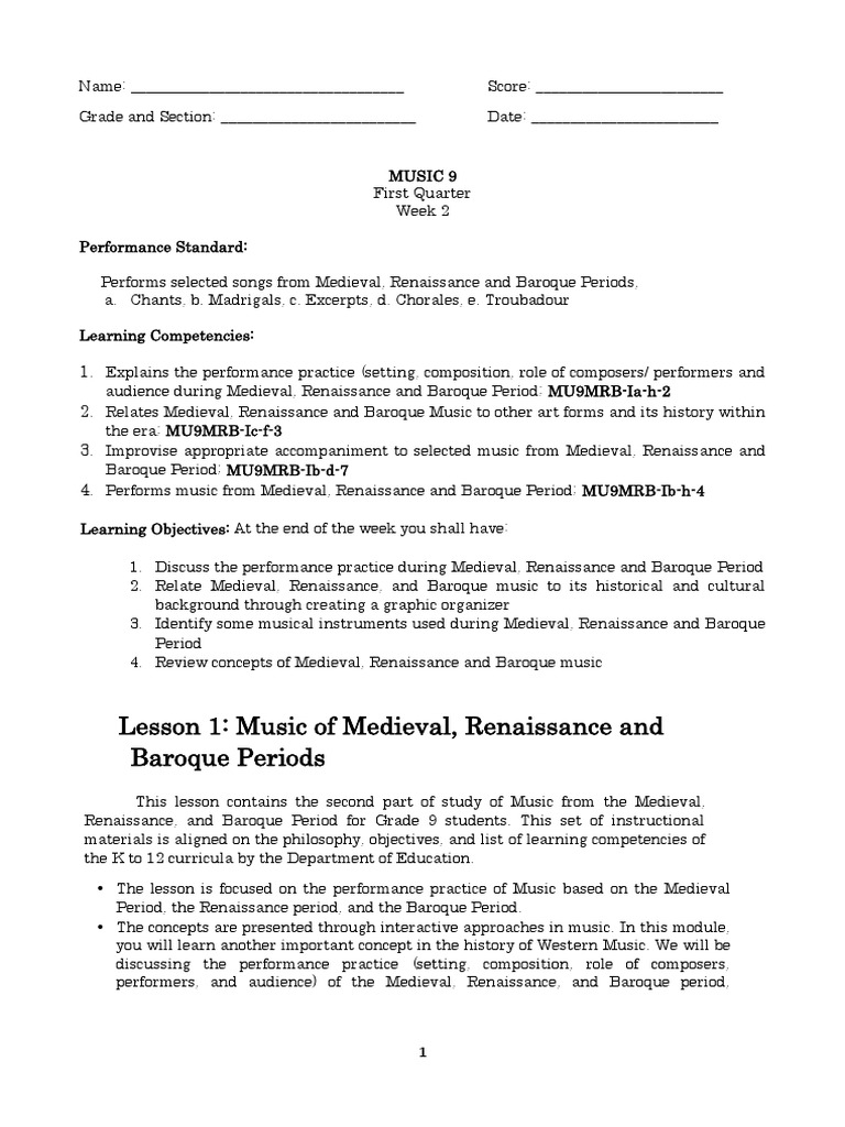 Renaissance, and Baroque Period for Grade 9 students. This set of instructional