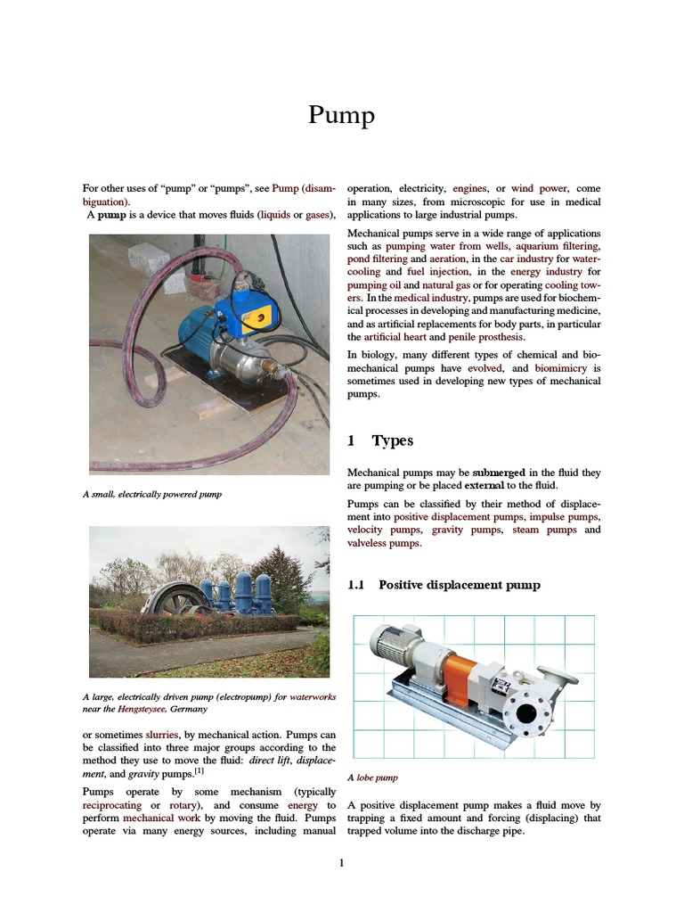 For other uses of “pump” or “pumps”, see Pump (disam- operation, electricity, engines, or wind power, come