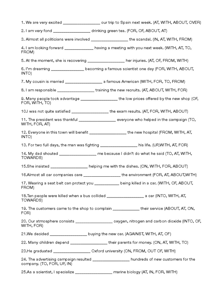 14. My dad shouted __________________ me because I didn’t do what he said (TO, AT, WITH,