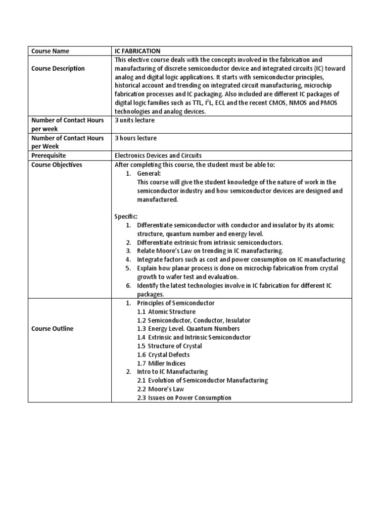 Course Description manufacturing of discrete semiconductor device and integrated circuits (IC) toward