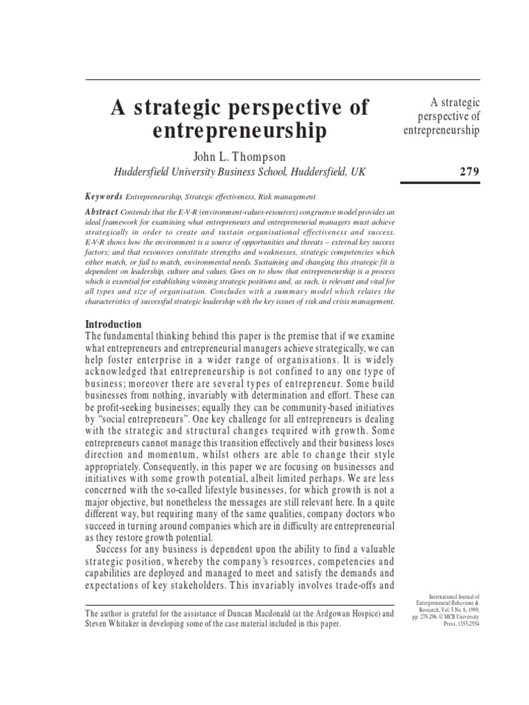 order to provide a strategic insight or perspective on entrepreneurial behaviour