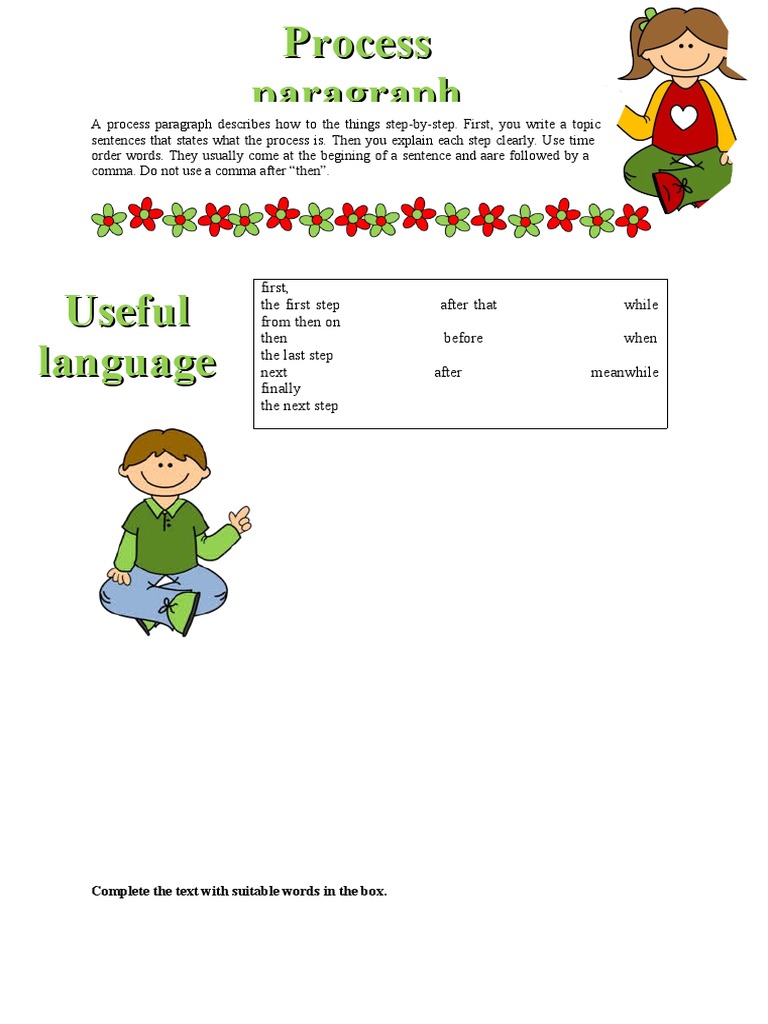 A process paragraph describes how to the things step-by-step. First, you write a topic