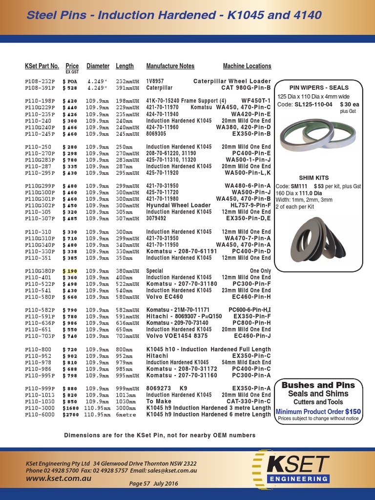 P110G300P $ 460 109.9mm 300mmUH 425-70-11720 WA500-Pin-J D Dia x 111.0