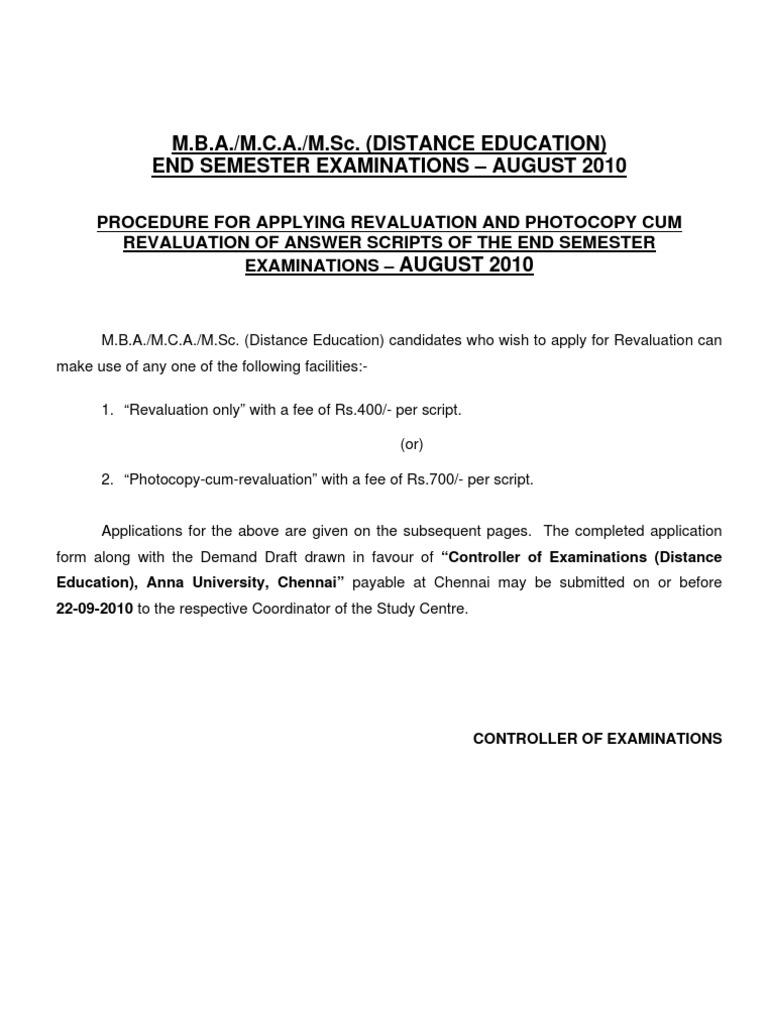 Examinations (Distance Education), Anna University Chennai, Chennai - 25 and the application shall be