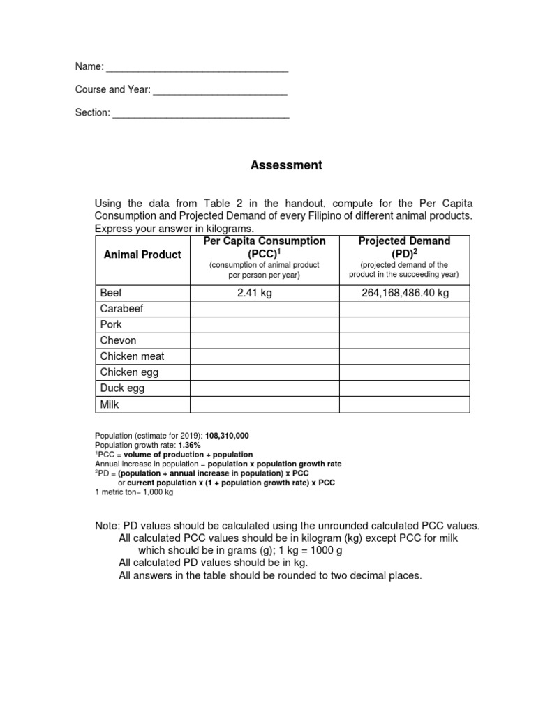 Using the data from Table 2 in the handout, compute for the Per Capita