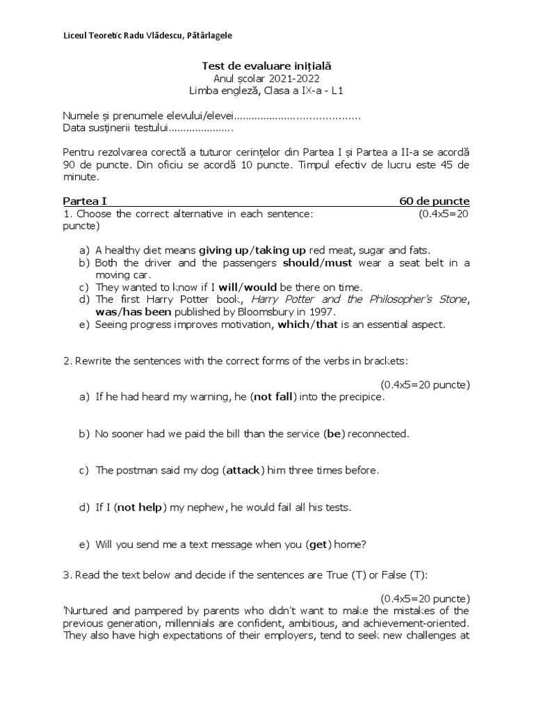 Subiectul 1: a) giving up b) must c) would d) was e) which (2 p)
