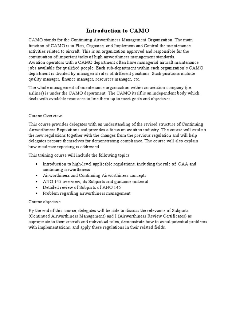 CAMO stands for the Continuing Airworthiness Management Organization. The main