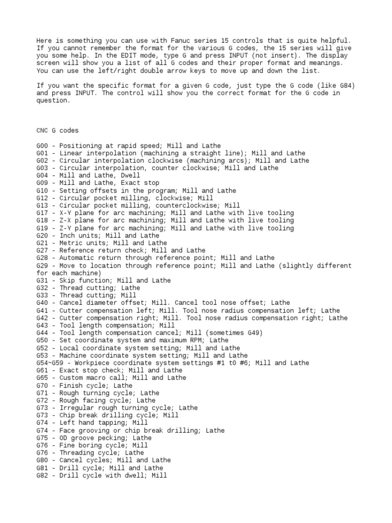 If you cannot remember the format for the various G codes, the 15 series will give