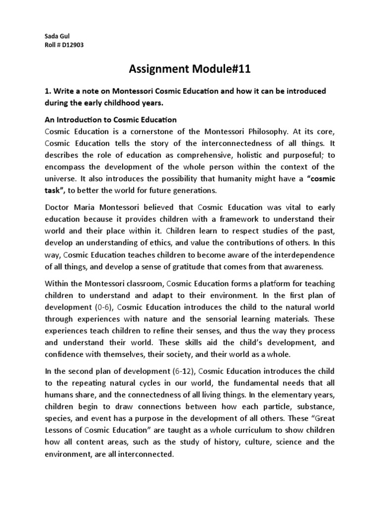 1. Write a note on Montessori Cosmic Education and how it can be introduced