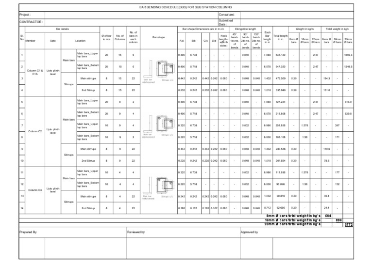 BAR BENDING SCHEDULE(BBS) FOR SUB STATION COLUMNS