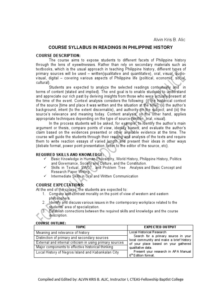 COURSE SYLLABUS IN READINGS IN PHILIPPINE HISTORY