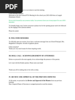 The agenda for the meeting included an opening prayer, singing the national anthem, welcome remarks from the PTA President, messages from the outgoing and incoming school heads, a message from a teacher representative, and closing remarks from the education committee chairman and barangay chairman.