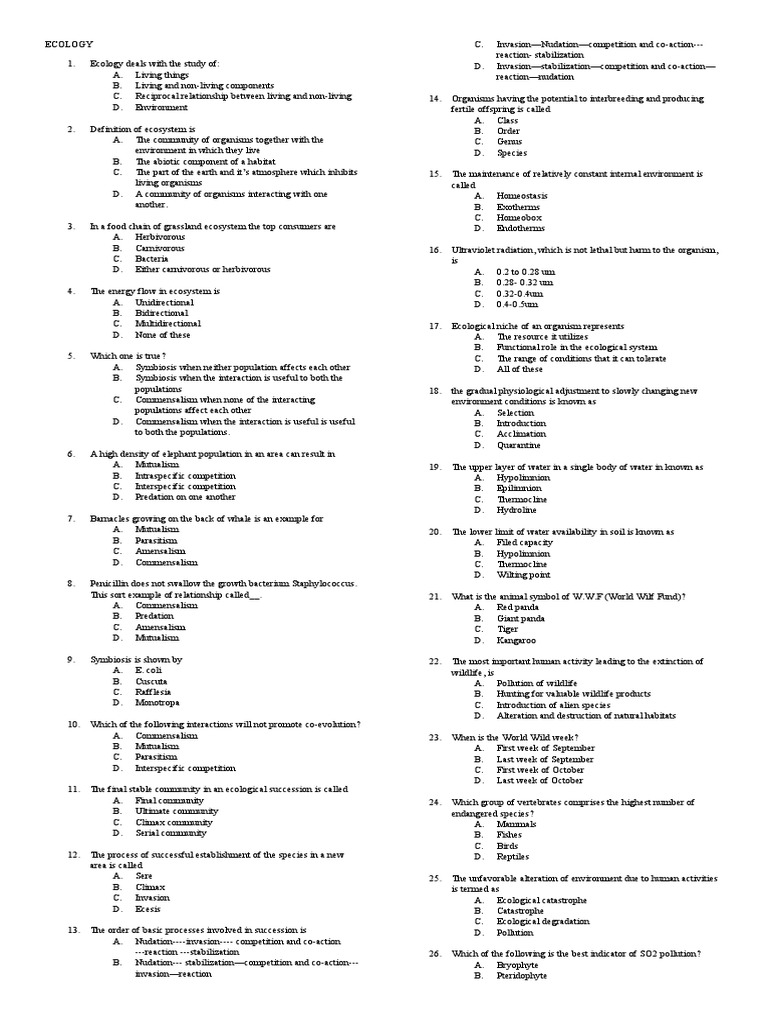 1. Ecology deals with the study of: D. Invasion—stabilization—competition and co-action—