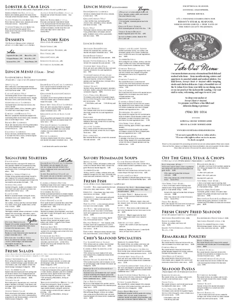 potatoes and vegetable de jour, finished with a Pan seared Parmesan crusted breast of land-lovers, Benny’s Steak & Seafood offers tempting
